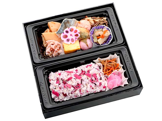 さわら塩焼き、若鶏ささみの梅しそ竜田、柔らか筍土佐煮、京揚げ入りぜんまい、ふきと筍の塩きんぴら、蓮根と鶏肉の梅仕立て、えびと枝豆のふわふわしんじょう、厚焼玉子、花ちらしれんこん、桜餅、お惣菜、竹の子と山菜ごはんor梅ひじきごはん
