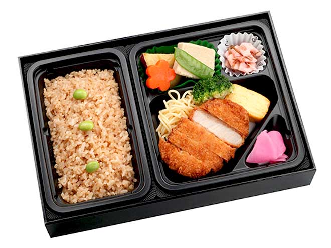 厚切りロースかつ、ソースたれごはん、高野豆腐煮、さつまいも甘煮、花形にんじん、きぬさや、厚焼玉子、ブロッコリー、お惣菜。