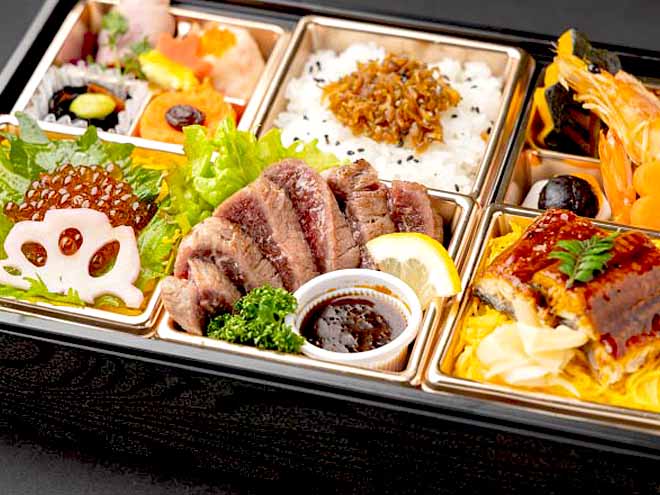 熟成した黒毛和牛のステーキに鰻を併せた贅沢を極めたお弁当です。おもてなしやお祝いのお席などにご満足いただけること間違いございません。