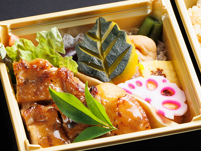 「鶏西京味噌焼き」は、鶏肉を西京味噌に漬け込んで焼いた、京都発祥の郷土料理です。西京味噌は、白味噌に酒と鰹節を加えて作られる、上品な甘みとコクのある調味料です。 鶏肉に漬け込むことで、臭みが取れ、風味が増します。また、焼くことで表面がカリッと香ばしく仕上がります。そんな鶏の西京焼きが盛込まれたお弁当は会議や接待、おもてなしにいかがですか。